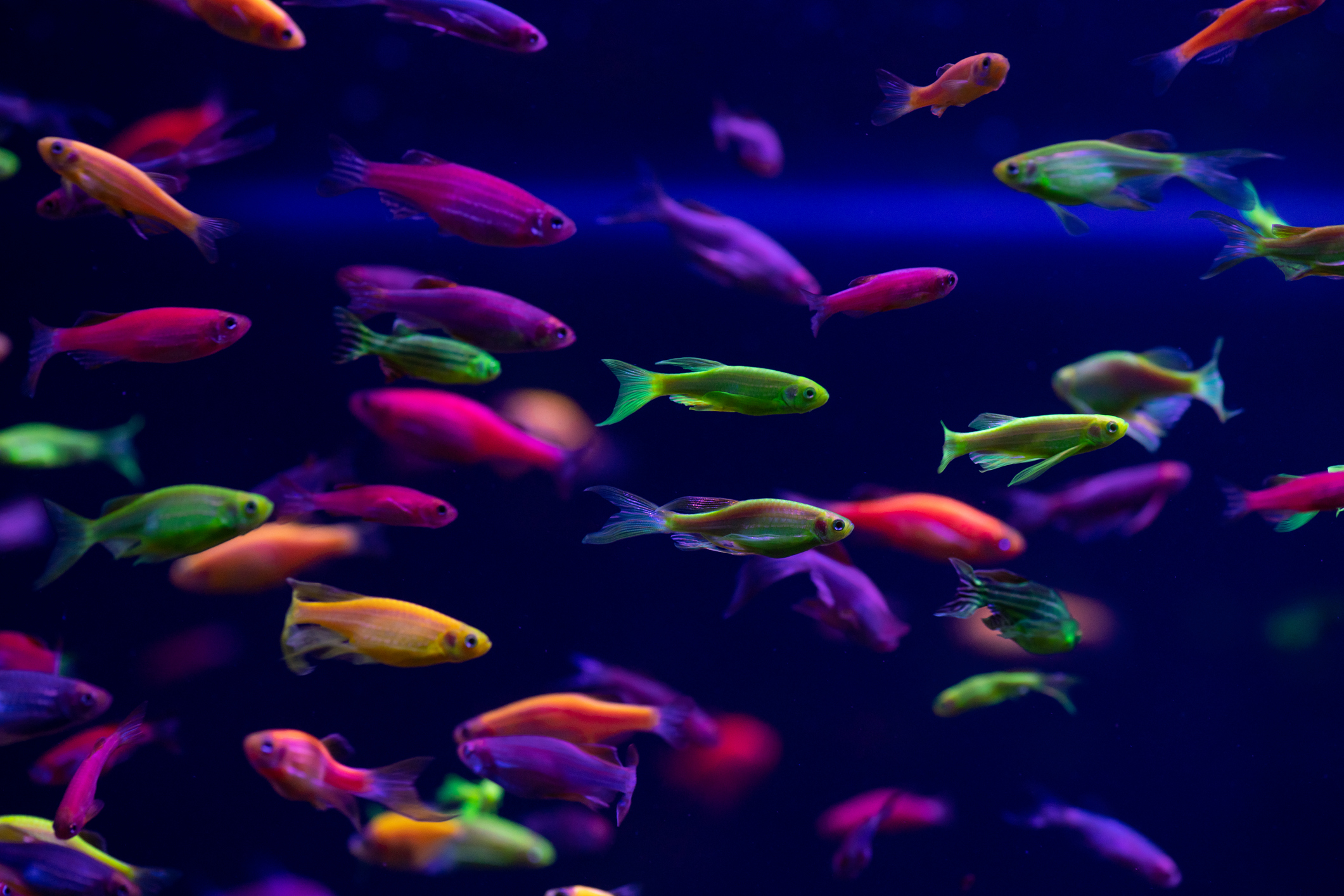 Sebrafisk, en fisk som hører hjemme i elvene i Bangladesh og India, har lenge vært populære blant både akvarister og forskere. De er små, robuste og har kort generasjonstid. Det gjør dem enkle å holde i fangenskap og godt egnet for forskere som interessert i genetikk og evolusjon. De første selvlysende sebrafiskene, laget med gener fra selvlysende maneter, ble til som del av forskning. Men få år senere kjøpte et amerikansk selskap markedsføringsrettighetene og solgte både selvlysende grønne, røde, gule, rosa og blå sebrafisker på akvariemarkedet. Dette ble starten på en ny trend med selvlysende GMO-fisk i private hjem.