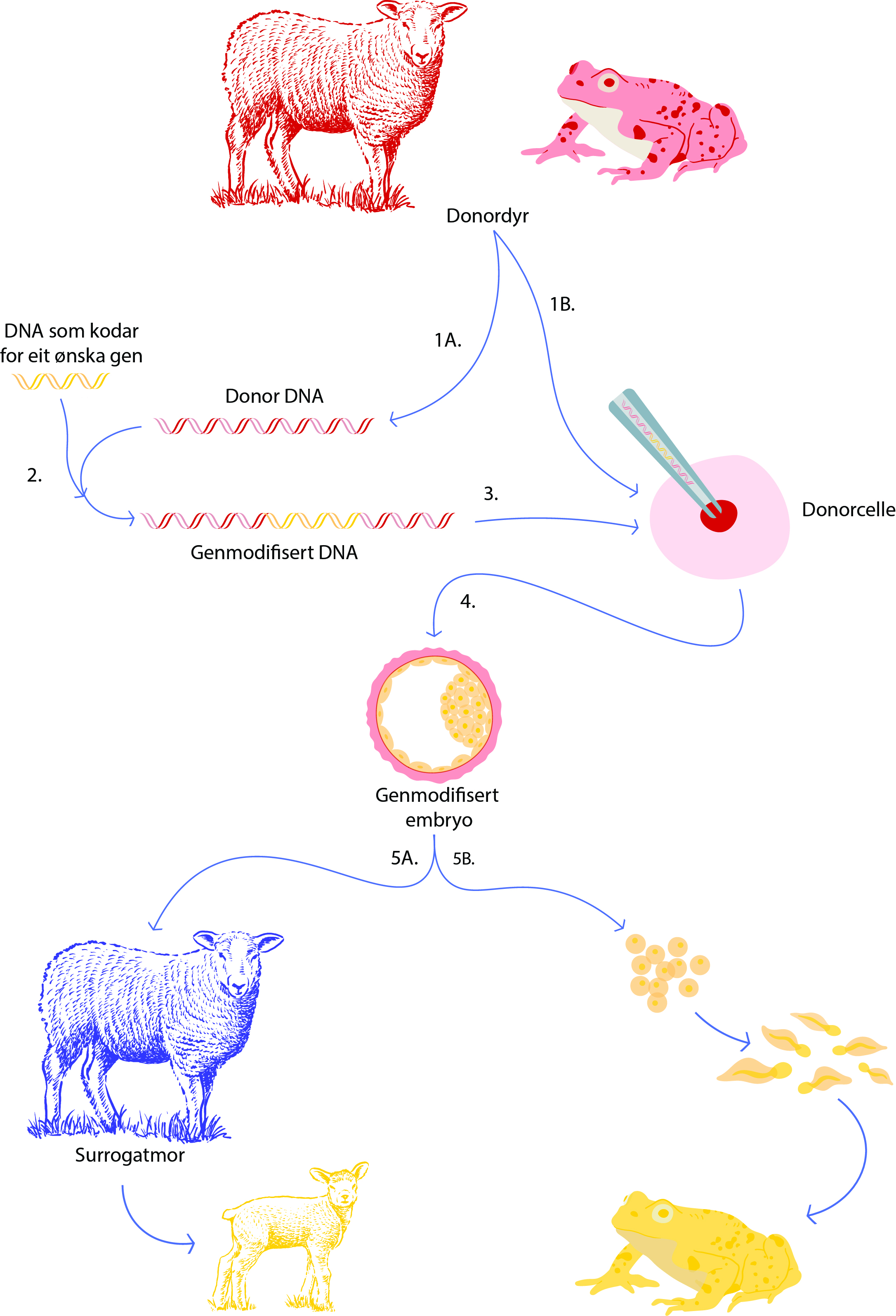 Deretter blir det genmodifiserte embryoet (4) anten sett inn i livmora til ei surrogatmor (5A) om det er eit pattedyr, eller får utvikla seg vidare i laboratoriet om det er eit dyr som legg egg (5B).