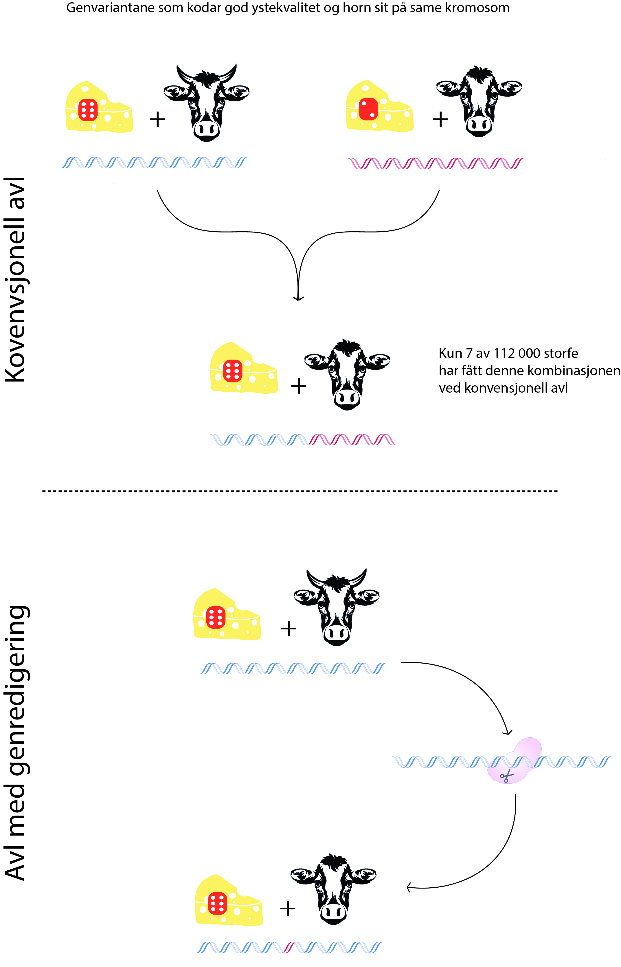 Norske mjølkebønder ønsker seg kyr som har mjølk med god ystekvalitet, men som ikkje har horn. Det er vanskeleg å få til med konvensjonell avl, då genvariantar som kodar for god ystekvalitet og genvarianten som kodar for horn sit på same kromosom. Ved konvensjonell avl har ein i dag berre klart å få frem 7 av 112 000 gentesta kyr som har denne kombinasjonen i storferasen Norsk rødt fe (NRF). Det er for få individ til at ein kan avla vidare på utan å få høg grad av innavl.