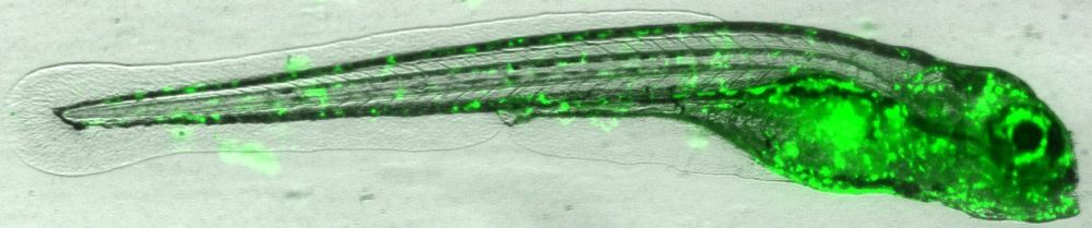 Sebrafiskyngel som er genetisk modifisert slik at makrofagene, en bestemt type celler, blir fluorescerende grønne. Foto: Lasse Evensen