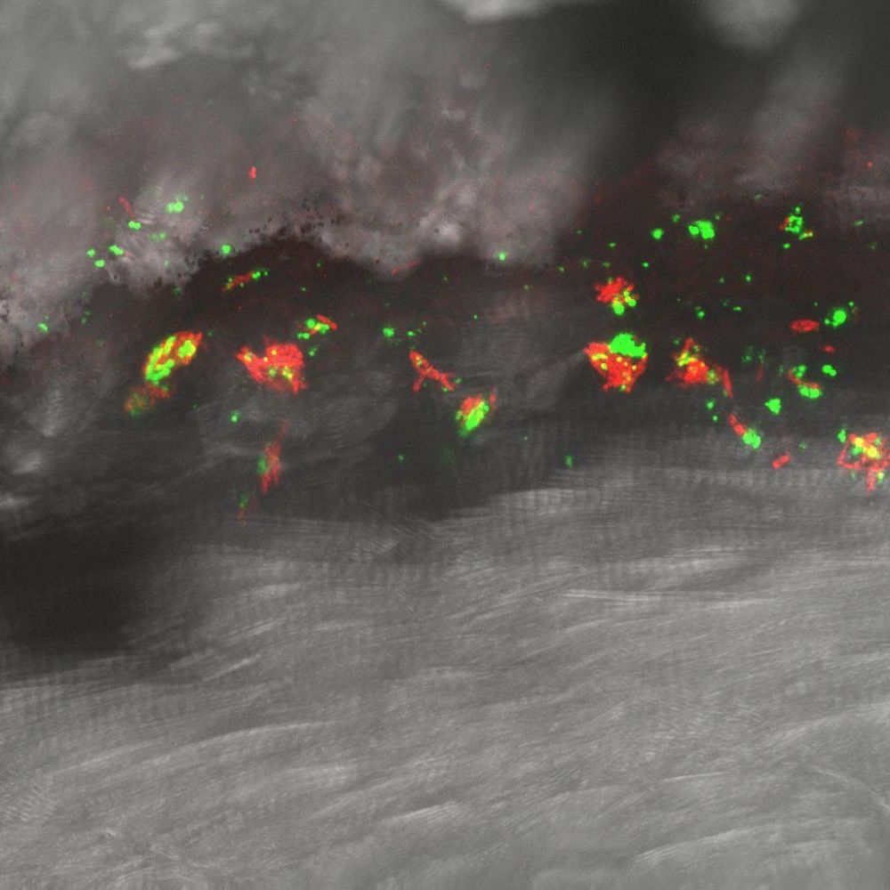 Røde bakterier (Mycobacterium marinum) havner nær grønne nanopartikler fordi begge tas opp i makrofager. Foto: Federico Fenaroli