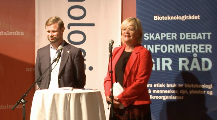Kristin Halvorsen forteller om Bioteknologirådets evaluering av bioteknologiloven og overrekker evalueringen til helse- og omsorgsminister Bent Høie.